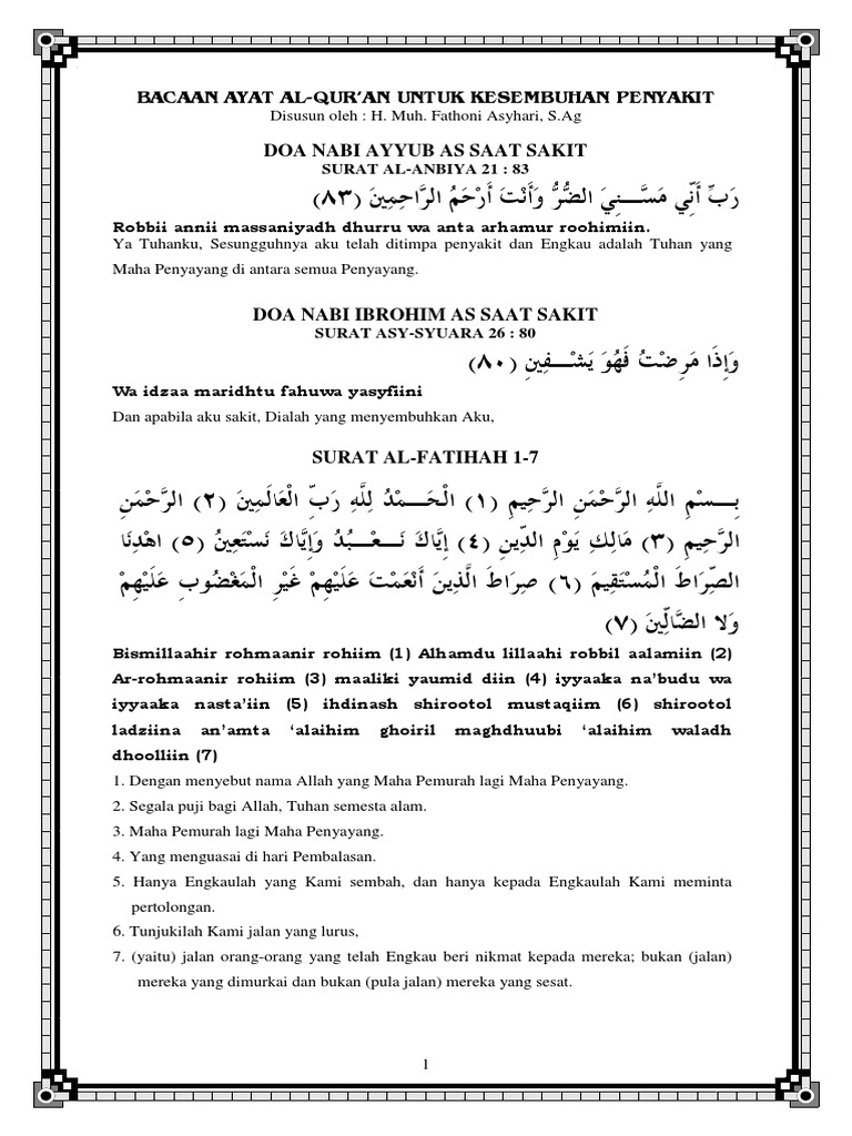 Bacalah ayat ke 6 sebanyak 77x pada 7 butir beras atau gandum dalam bejana mangkuk putih porselin yang sudah dituangi air. Penyembuh yang dimaksud di sini meliputi penyembuh atas segala penyakit, baik rohani maupun jasmani, sebagaimana yang akan dijelaskan dalam tafsirnya. Ayat suci al quran penyembuh segala penyakit. Download as docx, pdf, txt or read online from scribd. Ayat suci alquran penyembuh segala penyakit mp3 & mp4.